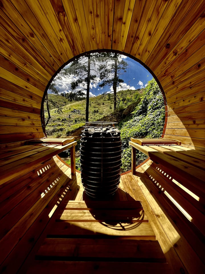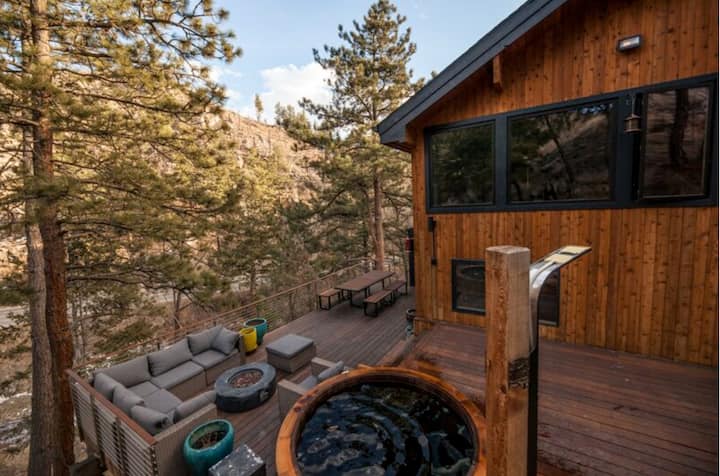 Welcome to the Rusty Skillet Ranch + Spa. Luxury A-Frame spa retreat secluded on 12 private acres, just 15 minutes from Boulder and 40 minutes from Denver. The ultimate retreat to relax and unwind. Features a Japanese Cedar Hot Tub, a Barrel Sauna, breathtaking views, indoor fireplace, outdoor shower overlooking a creek, and luxury indoor–outdoor living. An optional private lower-level suite is available for $250/night and includes three queen futon beds, it sleeps up to 6 additional guests.