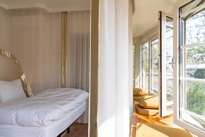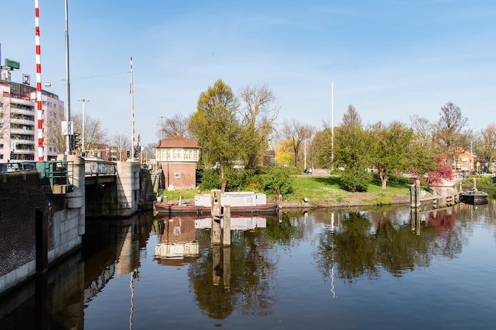 With the hotel room interiors, SWEETS hotel offers guests a unique and comfortable living space, while keeping the history of every bridge house in mind. All bridge houses are different, and so are the interiors. Every SWEET accommodates up to two adults and contains a kingsize double bed, a bathroom and coffee and tea facilities.
