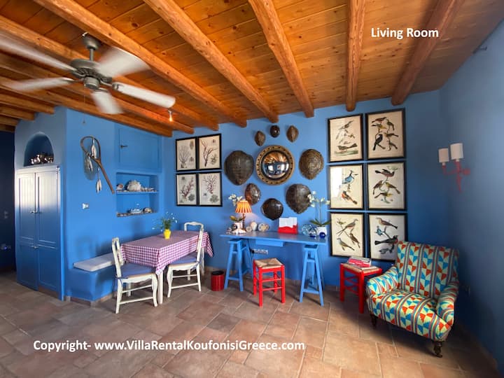 Idyllic, perfectly positioned Aegean island beach house in an elevated, sunset facing position, 10 metres directly above the beach. This perfect house on the west side of Koufonisi village with spectacular views has very easy and short walking access to all beaches, restaurants, bars, shops, gym, main harbour, night life and wonderful swimming directly in front of the house.