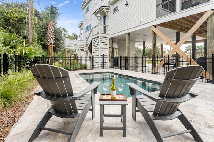 As you step inside this breathtaking, brand-new build located on the sought-after west side of Folly Island, Red Sunset welcomes you with beautiful views over the Sunset Cay Marina and Folly River and treats you to magnificent sunsets daily.