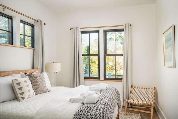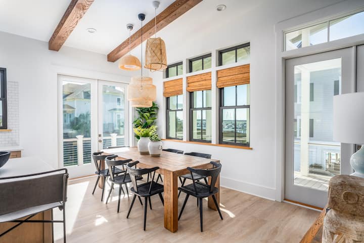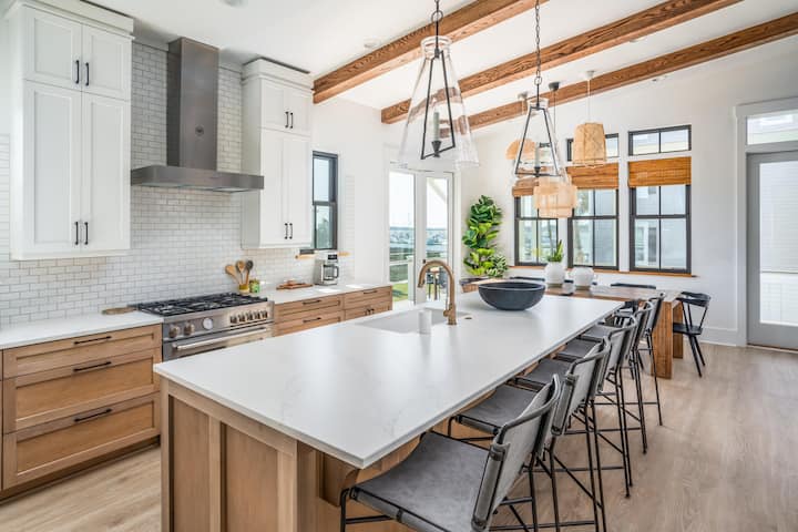 On the 1st floor, you will also find dual master bedrooms, each with a king bed and a dedicated and luxuriously appointed en-suite bathroom with dual sinks. The front porch features a bench seat and a single hanging chair, perfect for curling up with a book or for taking in the quiet views off the front of the house. A stylishly decorated ½-bath powder room located near the entry foyer rounds out the functionality of the 1st floor.
