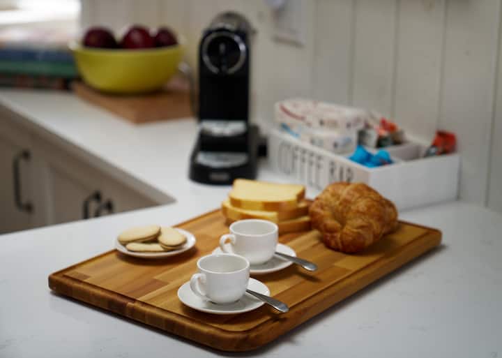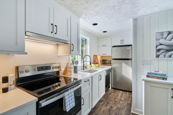 Kitchen - Completely renovated with skylit open design, white shaker cabinets, quartz countertops, stainless appliances. Fully equipped including complete coffee setup: Nespresso (complimentary pods), drip coffee, Italian Bialetti moka, kettle.