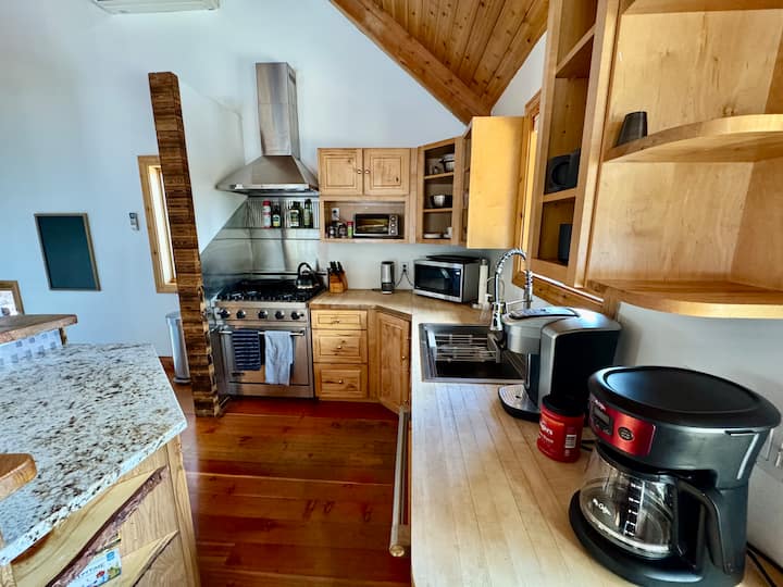 We’ve stocked the cabin with a Chemex pour-over setup, grinder, standard coffee maker, and a selection of complimentary K-cups. You’ll also find a kettle with assorted teas and hot chocolate.