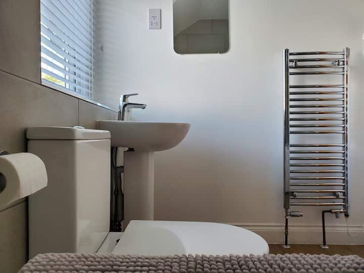 The bathroom contains a bath with integral shower and glass shower screen, WC, single wash-hand basin, heated towel rail, mirror and shaver socket. The switch for the heated towel rail is just outside the bathroom door by the socket. A bath mat, non-slip bath mat and 2 cotton hand towels are provided in the bathroom. Six cotton bath towels are also provided, 2 in each bedroom.