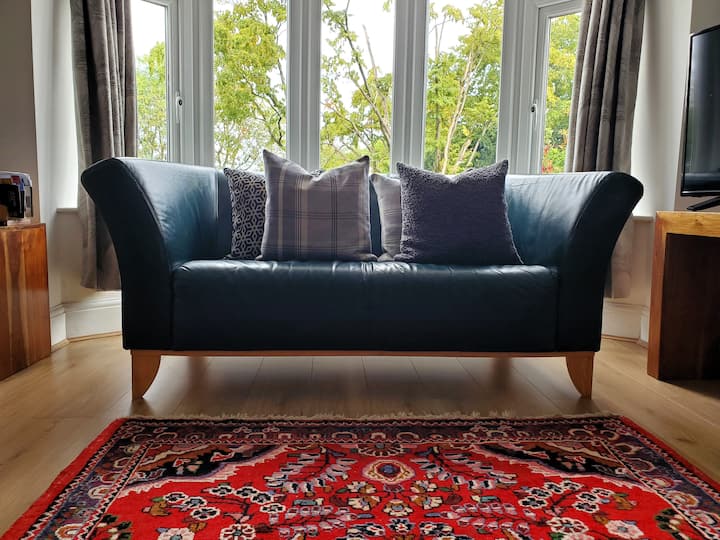 The main living space is accessed via doors from both the entrance hall and kitchen. Conveniently located adjacent to the kitchen, the dining table seats six people. The lounge is located at the opposite end of the room, where the large bay window offers views to the front of the cottage; this area contains two comfortable sofas, an armchair, foot stool, smart TV and occasional tables. There are also several cosy blankets, perfect for snuggling under with a good book or movie - or to add to a bed if needed.