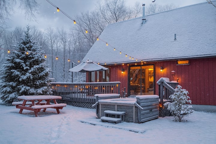 Welcome to Sojourn Chalet by Sojourn STR. Set on a private 1 acre in the sought after Towamensing Trails community, this design-forward A-frame chalet is your romantic escape into the woods. With a bubbling hot tub under string lights, a wood-burning fireplace, a Nespresso-fueled coffee bar and a vibe that feels like your favorite boutique hotel -this isn’t just a stay, it’s a mood. Perfect for couples, small families, small groups of friends looking to reconnect, reset, and retreat in style.