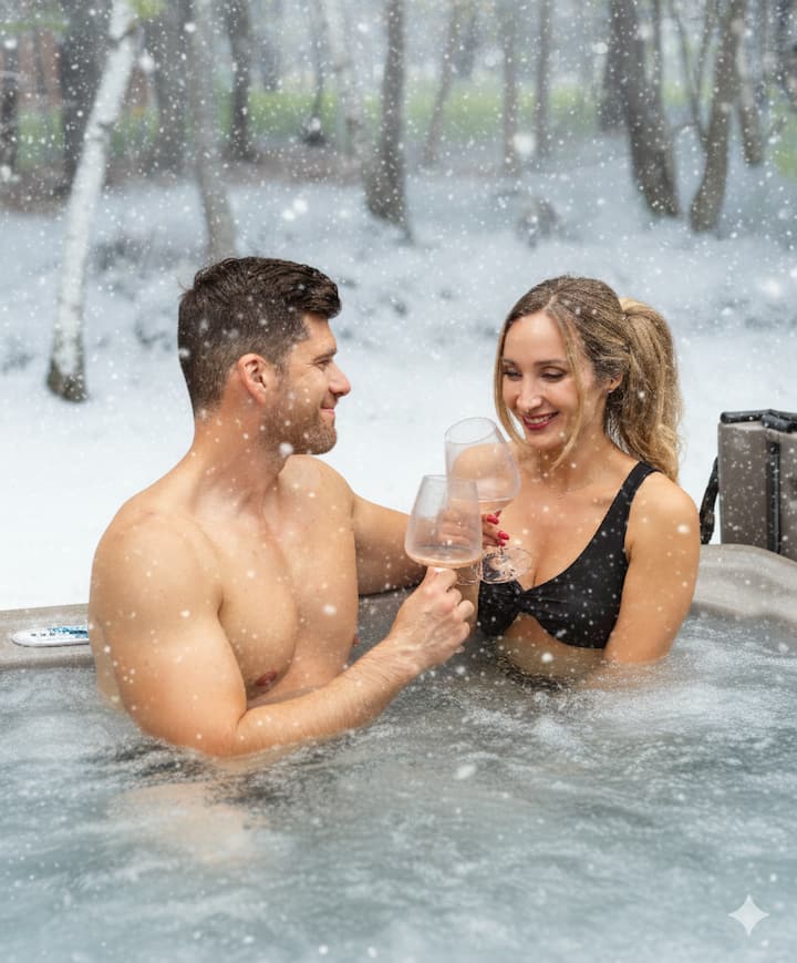 🛁 Romantic hot tub under twinkling string lights — steam, stars, and serenity