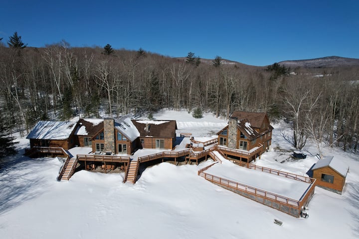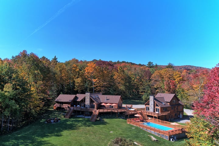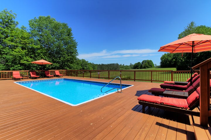 One of a kind majestic log house private estate on secluded 23 acres is terrific size and layout for multiple families or a group of friend. You'll find everything you need to be as relaxed as possible during your stay. The space is tastefully decorated with a lot of new furniture and amenities. These include a 32 feet heated salt-water swimming pool, a game room with a billiard table, a state-of-the-art large outdoor hot-tub and a new sauna in its own building!