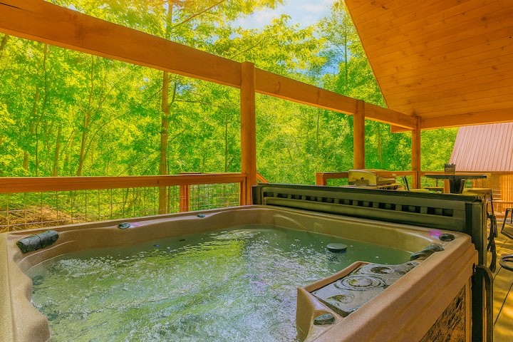 The outdoor lounge spaces and expansive balconies completely surround you with the beauty of the Smoky Mountains. Slide open the sliding glass doors from the living room and step out onto the huge deck. This covered space has a brand new hot tub, stainless steel grill, high-top dining area, and comfortable rocking chairs. Enjoy your coffee out here with a view, or fire up the grill and serve a family-style dinner with the wilderness as a backdrop.