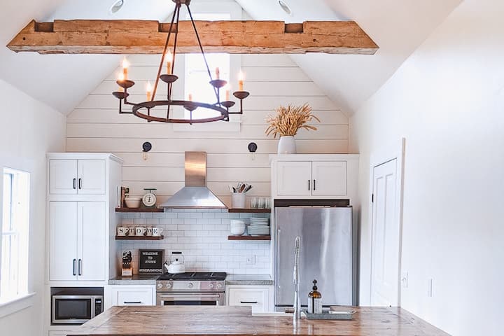This 1864 farmhouse underwent a full renovation to create a unique hospitality experience for guests. You enter through the front door into the kitchen - the heart of the home. The full chef's kitchen, accented with cathedral ceilings + hand-hewn beams, provides guests with an upscale-cooking experience, down to the appliances + cutlery. Music + conversation flow freely as guests can cook and relax together within the open concept floor plan. A mudroom off the back of kitchen allows extra storage for those boots, coats, and gear.