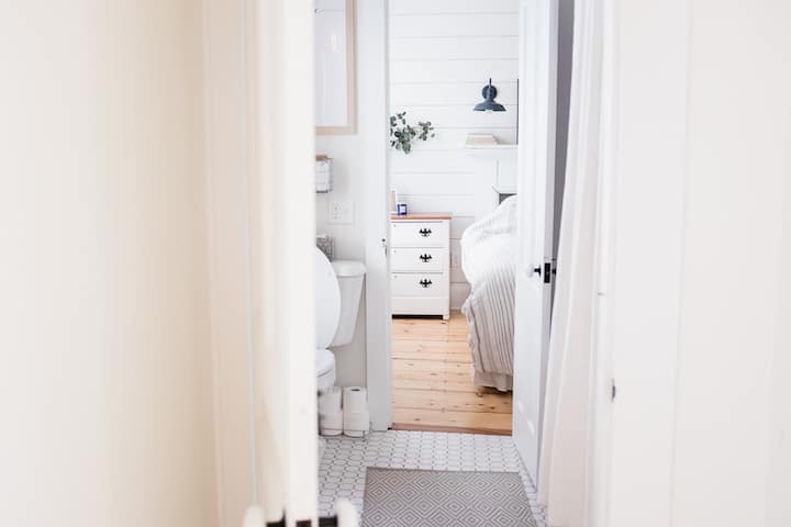 At the end of the hallway, you'll enter Bedroom 4, the Primary Bedroom with a king bed and en-suite bath. This room has a reclaimed barn wood ceiling, a dresser, and a private bathroom that all guests will want to enjoy. The Primary Bath offers aged brass faucets and a vaulted shiplap shower with flush-entry. Ursa Major Shampoo, Conditioner and Body Wash are provided for all guests as well as soap, lotion, Qtips, cotton balls, first aid kit, and make-up towels.
