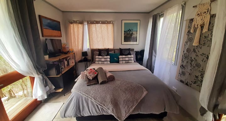 The Avem Haven and its surroundings offer a secluded retreat, featuring a quaint private outdoor nook enveloped by trees, complete with an outdoor bath/shower and a fire pit. While guests are encouraged to explore the property, including a wander down to the creek and through the bush, we kindly ask that you maintain a respectful distance from other accommodations to preserve the privacy of fellow guests.