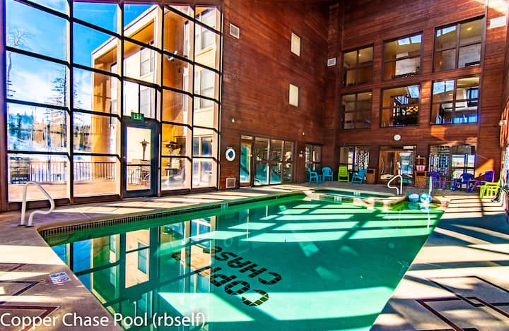Copper Chase is a premiere condominium project with ski-in/ski-out access to the Navajo ski basin. Copper Chase boasts a large solarium pool/Jacuzzi with an adjacent fitness room. Amenities also include separate male/female saunas in locker rooms, large group sitting/meeting/lounge area with a fireplace and large LCD TV, a guest business center with computer and printer, summer sun decks with two BBQs, and a picnic area with volleyball and open play area. The FREE town shuttle that operates during ski season stops at Copper Chase and serves both ski basins as well as most lodging and restaurants.
