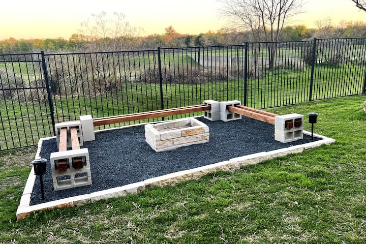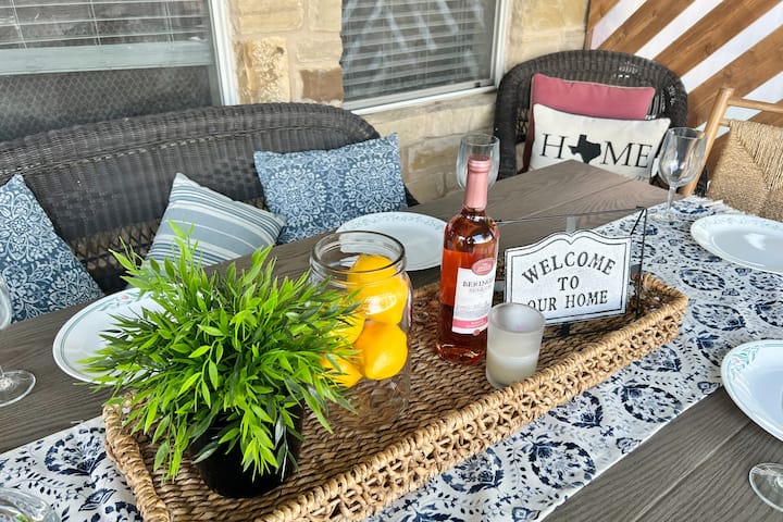 Beautiful home with four bedrooms 2 living spaces located in the city, but with a feeling of being out in the country. Kitchen granite countertop with a gas cooktop, double oven fully stocked to prepare family ,BACHELORETTE destination, friends or company’s meals. You will find a formal 8 sitting dinning table area expanding into the open living space with a unique fireplace and large windows looking out into the covered patio with an inviting green back yard. You will also find a light-filled breakfast area, perfect for eating or as many needed space for studying or working area. Downstairs you will also find the tranquil master suite with a double door window that leads you to a front porch, and a double vanity bath that has a lovely soaking tub and a glass-enclosed shower. Extra full bath downstairs. Upstairs you will find 3 comfy bedrooms with a secondary full bath . A second living space/game room that has a marvelous view of the back yard and downstairs of the living space . Plenty space for everyone to enjoy . 3 SMART TV'S . 55 inch on the down and upstairs living and 1 in bedroom.