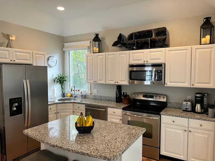 I would bet we have one of the most well-appointed kitchens you'll ever find in any rental property, with granite counter tops, a large island with two bar stools, high end Calphalon cookware, and every tool you could imagine (garlic press, cheese graters, storage containers, SodaStream seltzer maker, Keurig coffee maker, Kitchen Aid food processor, InstantPot, and crockpot). Of course, you'll also find a microwave, dishwasher and toaster. And if you like to grill, we have a Weber gas grill you can use just outside the front door.