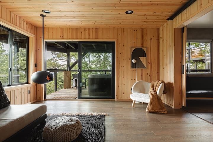 Bear Mountain Chalet was designed by Studio Lins (ig @studiolins_design) and spans three floors with breathtaking views of the mountains and national forest. It has 2000+ sq. ft. of indoor living with high-end decor.