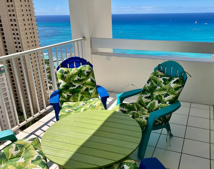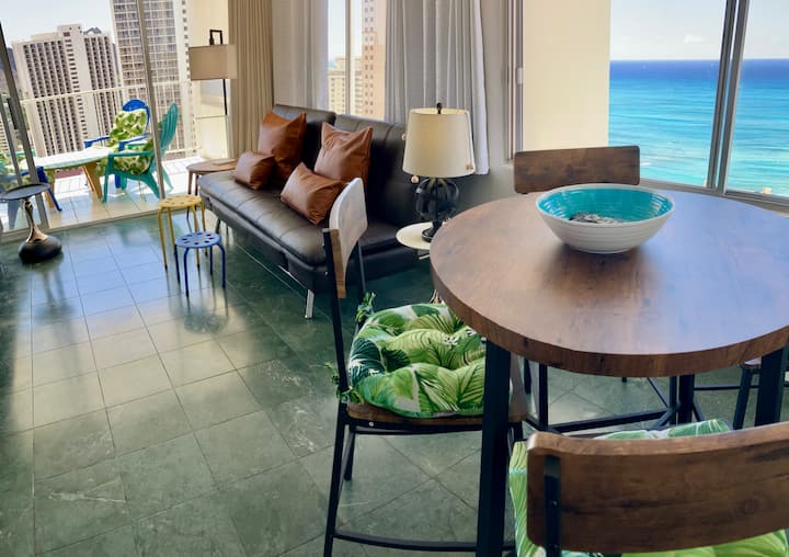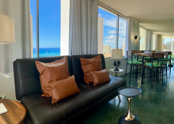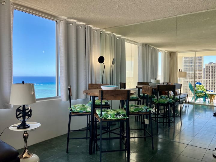 Picture this: Rooftop Saltwater Pool, Jacuzzi _Gas BBQ Grills with Tropical breezes with Direct Ocean Golden Sand & Waikiki Waves or SUP just 700 steps away! 🌊 Stay in our Chic Direct Ocean View 1bdrm w/ Kitchen Wi-Fi, AC & private lanai. Steps to dining, shopping & Diamond Head! Make New and unforgettable memories in Waikiki 🌺 tag your travel buddy & plan your escape!