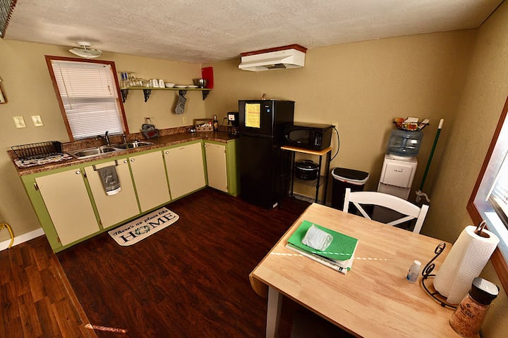 The Kabin offers a private bathroom with a large step-in shower inside the house; and a kitchenette with a fridge, microwave, coffee pot, crock pot, dishes, pots & pans, basic cooking necessities and a sink. There is NO cook stove inside, but there is a gas grill outside for your cooking needs. Keeping in mind that there are several restaurants in the vicinity for a cook free vacation.
