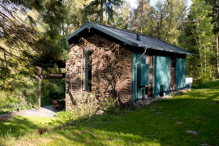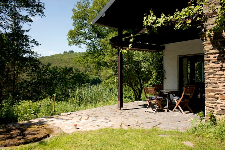 The slate stone house is situated on a plateau with plenty of midday and evening sun and is surrounded by a wooded hillside that has been growing on the abandoned vineyards for over 70 years. Below the property runs the Ruwer-Hochwald cycle path on the old railway line between Hermeskeil and Trier and the hiking route of the Saar-Hunsrücksteig. which runs right through the Hunsrück-Hochwald National Park. Bicycles can be rented two towns further in Gusterath-Tal from “Drive and Feel it” driveandfeelit(.)de.