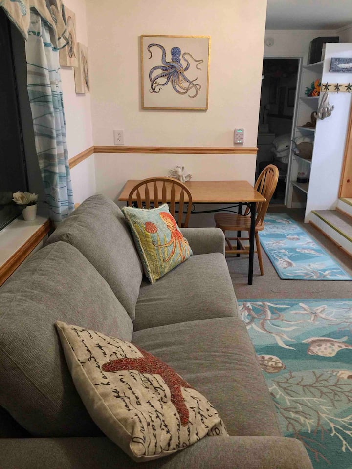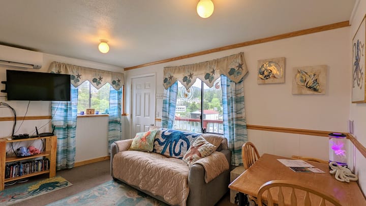 Octopus Hideaway features charming octopus-themed decor in a cozy studio apartment that sleeps up to 4 guests (incl. infants), with a queen bed & double-size sleeper sofa with a memory foam mattress. The kitchen is fully equipped with a full-size fridge and stove/oven, microwave, & coffee maker. Full size washer & dryer are inside the apartment. Separate rooms for toilet/sink, & shower. Guests also enjoy discounts at Carrie's cafe, museum, & whale watching trips! Off-street parking for 1 car