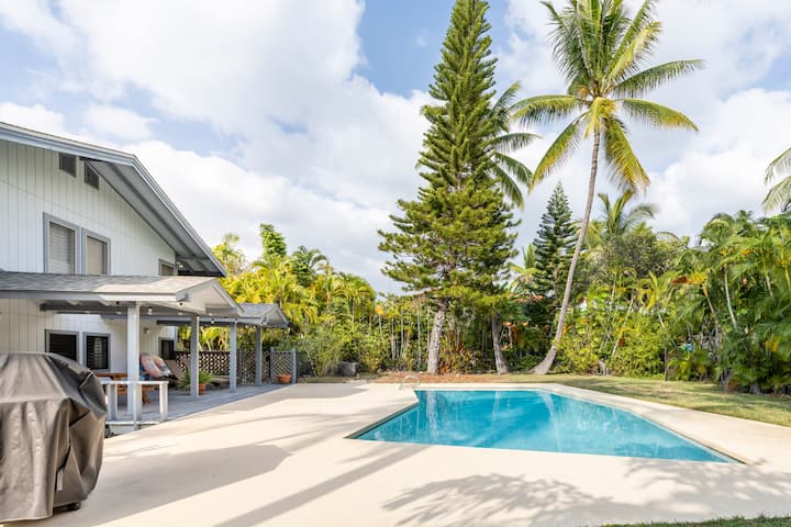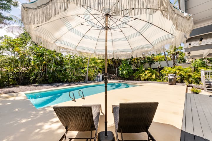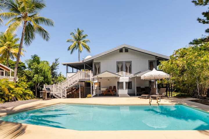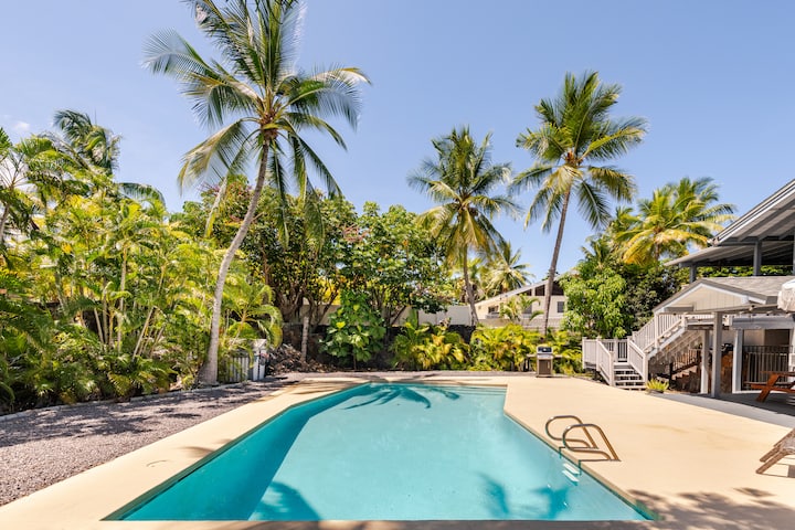 Experience this tropical oasis, conveniently located in Keauhou. With a 2 minute walk to the ocean - watch the breathtaking sunset, stargaze at night , and fall asleep to the ocean waves crashing into Heeia Bay! Awake to the wild song birds as you sip on your Kona coffee, and plan your Big Island adventure. Enjoy an afternoon cocktail by the pool, perfect for yoga, reading a book, or cooling off. Walk 5 minutes to nearby delicious restaurants, or a 10 minute drive to downtown Kona.