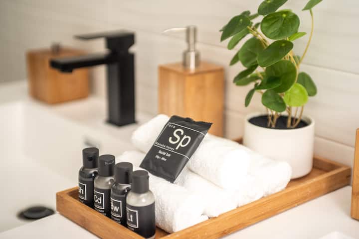 - Bathroom amenities: shampoo, conditioner, lotion, body soap, facial soap, and makeup remover wipes.