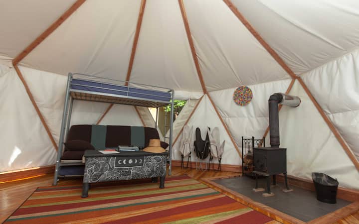 Got a group that likes to camp? This secluded, off-grid (no plumbing or electric) package includes our Yome Away from Home and the Nook, along with extra space for tents. The Yome can sleep 6 and the Nook can sleep 10. If you have more than 16 people, please book additional primitive campsites for the rest of your group, 20 people max. In consideration of other guests, please be advised that access to the Community Kitchen is limited (see full description for details). NO PETS - NO EXCEPTIONS.