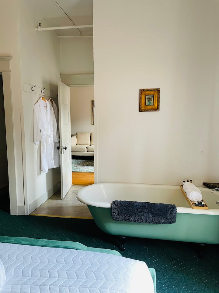 •Private bathroom with clawfoot soaking tub. Tub is in the bedroom. No shower.