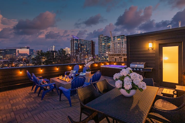 The rooftops are the reason this home is in such high demand. The star of the show is definitely the private hot tub on the rooftop with panoramic skyline views of Nashville. There's also a gas fire pit and grill as well as plenty of seating for everyone to relax and have a good time.
