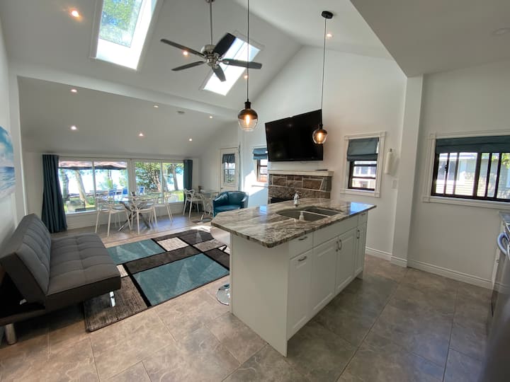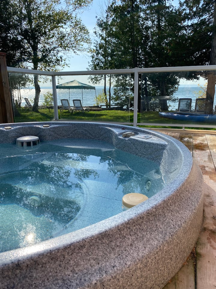 Beautiful waterfront cozy family cottage, newly renovated with uplifting vistas, skylights, clean modern kitchen design, original stone fireplace (natural gas insert), HOT TUB SPA and SAUNA.
