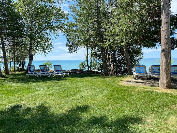 Nice mix of trees on the waterfront lawn for choice of full sun or shade when lounging overlooking the water. New Webber BBQ. Fire pit with one bag of supplied firewood.
