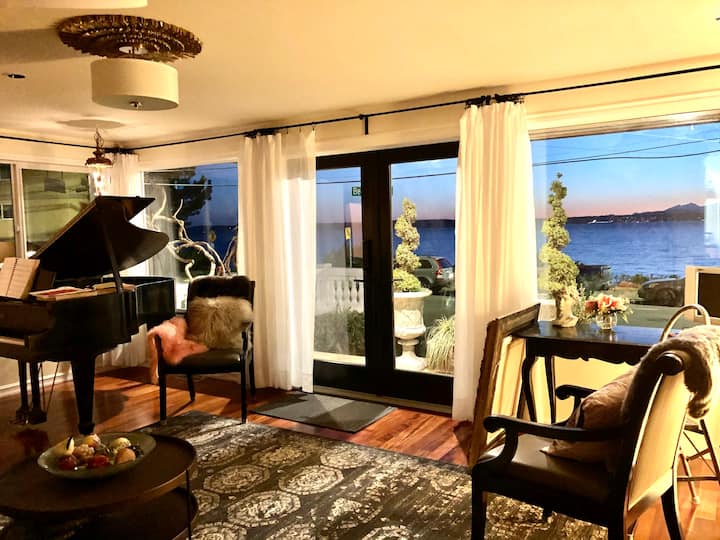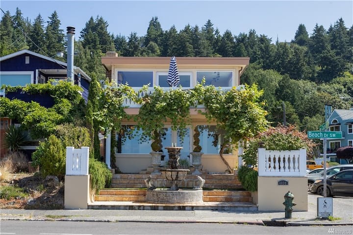 Amazingly beautiful beachfront water view villa on salt water Puget Sound. Watch whales and seals frolic in the waves. Bring your kayak or sailboard or rent them nearby. Bike trails nearby! Dine at La Rustica Restaurant across the street. Relax in Alki Spa nearby. Chef’s kitchen w/Viking appliances. King-size bed w/attached stone bath. Owners live onsite but you have your own private apartment w/separate entrance, beach access, free parking & complimentary Continental breakfast!