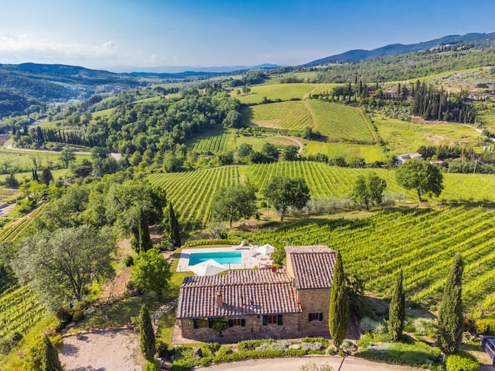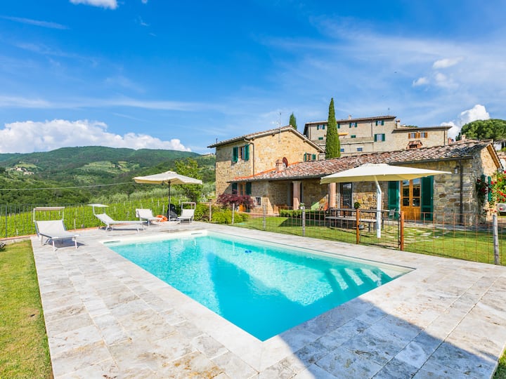 Casa 360, a modern villa with a private pool in Borgo Savignola, can accommodate up to six people and is surrounded by the vineyards of Savignola Paolina. Recently renovated, it offers contemporary comfort in a Tuscan setting. The property includes four other units for larger groups. Guests can enjoy the Tuscan experience with tastings, traditional lunches, themed evenings and cooking classes on request. From 2026, a pickleball court will also be available. agriturismo on a vinyard "Savignola Paolina", built in 1700. 5 apartments in the property. 3 km from the centre of Greve in Chianti, 35 km from the centre of Firenze, 46 km from the centre of Siena, in a sunny, elevated position on top of a hill, in the countryside. Private: garden 500 m2 (fenced), swimming pool (8 x 4 m, depth 140 cm, seasonal availability: 04.Apr. - 30.Sep.). Outdoor shower, garden furniture, barbecue, pool maintenance by the owner/gardener. In the complex: reception, massage (extra). Cook on request (extra). Breakfast and half board possible on request (extra). Motor access to the house (200 m via unmade road). Parking on the premises. Shop 3 km, supermarket 3 km, bus stop 3.3 km. Golf course (18 hole) 20 km. Nearby attractions: Panzano in Chianti 8 km, Badia a Passignano 12 km, Radda in Chianti, San Donato 18 km, Castellina in Chianti 20 km, Gaiole in Chianti 30 km, San Gimignano 46 km. Please note: suitable for families. Suitable for events. Cooking courses bookable on request. Local sale of farm products. The owner lives on the same property.
