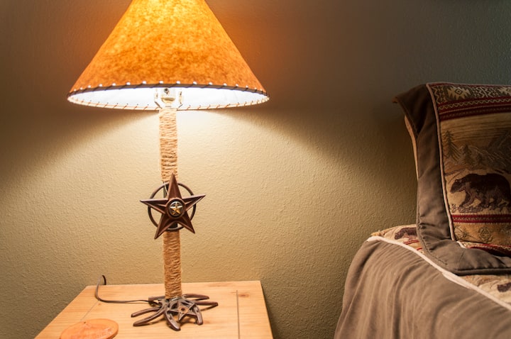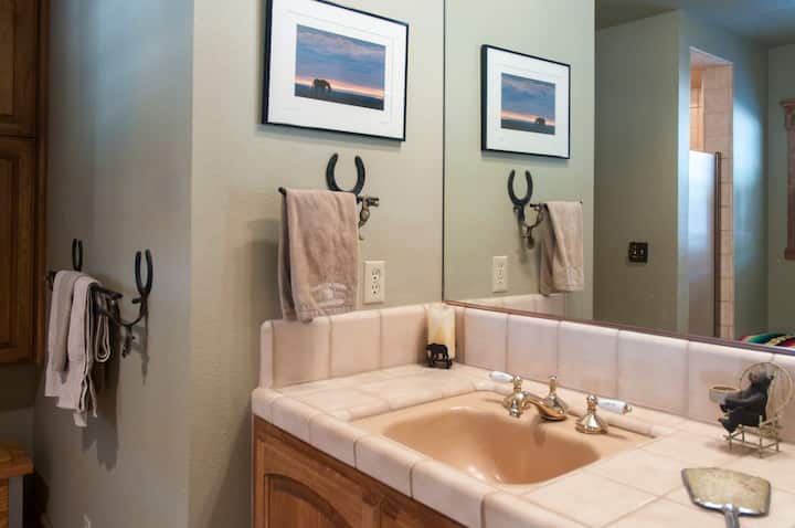 Wrap yourself in western luxury on our historic ranch as you enjoy this private, cozy bedroom with comfortable queen bed and large bathroom across the hall. This is a room rental within our home. It is not a full house rental. The downstairs bedroom and bath are handicap accessible. We also offer guided horseback riding, ranch cooking, and hiking here on our beautiful 41 acre ranch. This room has one queen bed for 2.