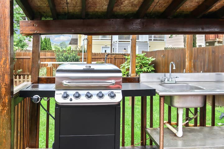 It features a shared hot tub, outdoor kitchen, extensive decking, driveway parking, a private gated yard, professional landscaping, & free bikes for guests (April 1 - October 31). Close to everything, but far enough away to be quiet.