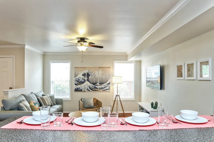 The fully equipped kitchen includes a large pantry, kitchenware, microwave, large toaster oven, drip coffee maker (& premium coffee), and full-size refrigerator -- plus a washer/dryer for added convenience. Custom finishes throughout the space include bamboo wood floors, ceiling fans, crown molding, wainscoting, and detailed tile work. Both the bedroom and living room feature wide-screen smart TVs.