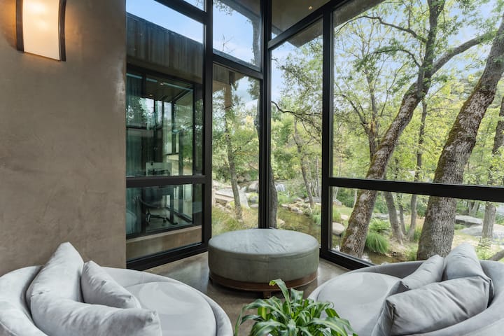 Designed by Conrad Asturi and inspired by Frank Lloyd Wright’s “Fallingwater,” this luxury Yosemite Airbnb seamlessly blends into the natural landscape with floor-to-ceiling windows, warm lighting, and high-end finishes. Hundreds of feet of riverfront, a private waterfall, and an islet offer a truly immersive & intimate experience with nature.