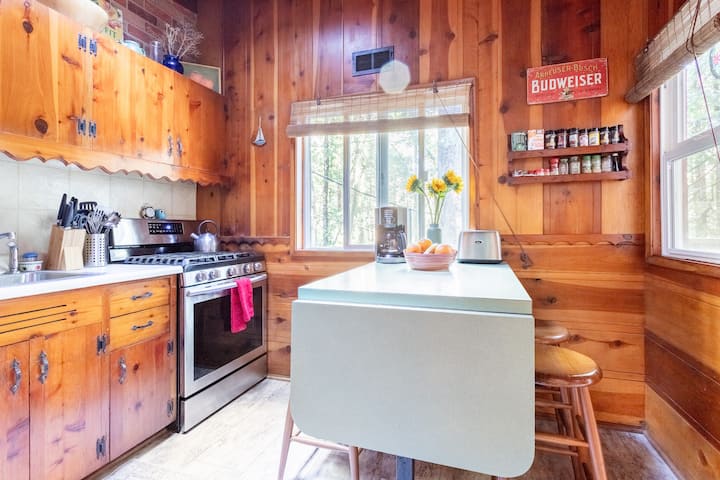 One focal point is a fun, retro 50's kitchen that’s both a little bit kitschy and way classy. This full kitchen retains some period charm and has been updated with a sweet eat-in dining area.