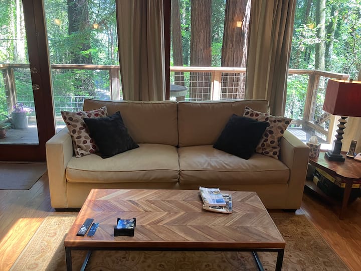 Situated high above the street, the comfortable front deck offers panoramic views of the abundant redwoods surrounding the Tree House. And a cool wine barrel table with 2 stools provides a great spot for a snack or cocktails, while taking in the views.
