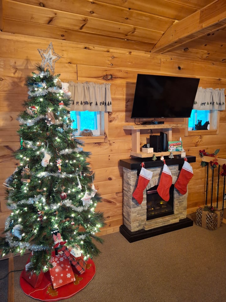 The interior of the camp is beautifully covered with native pine boards. The living room, dining, kitchen and bar area all share an open space making it fun to cook and still interact with other guests or family members. The master bedroom has a king bed, flat screen TV and two closets. There is also a peekaboo window to watch the sun rise. The second bedroom has two full over full bunk beds and according to our sons, the best mattresses they've ever slept on. There are 3 large windows to view the pond and a sliding glass door to the deck.
