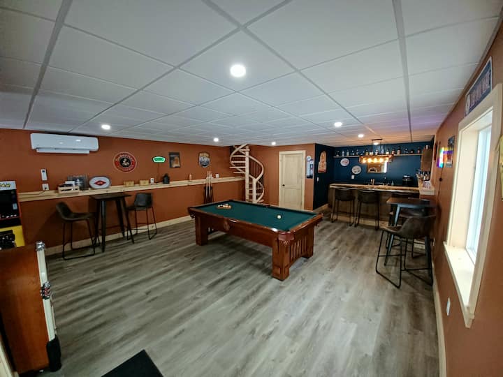 We just finished renovating the camp adding a full basement downstairs. You can access it by going down the custom made spiral staircase. The custom made bar has everything you need, except the booze. Red, White, Whiskey, Champagne & Beer glasses are displayed on the custom made shelf. There's a mini fridge under the bar, an ice maker & martini mixer.