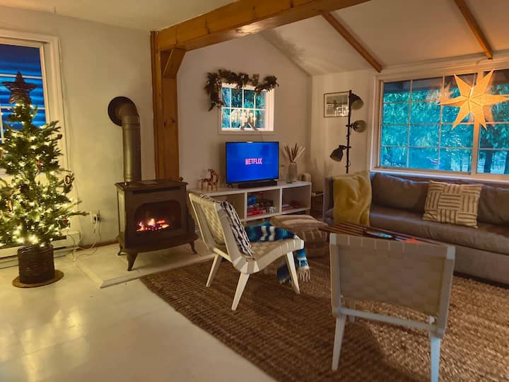 This is the most adorable 2 bedroom/1 bathroom country cabin from the 1940s, updated with a brand new kitchen and bathroom offering vintage charm with modern conveniences. The front door leads into a spacious mudroom which opens up to the combined living/dining room with a dining table, sofa, and lounge chairs centered around the gas fireplace (no need to run out for firewood!). The adjoining fully stocked kitchen features an island with plenty of space to prepare meals. Both bedrooms have laptop-friendly workspaces and fast, reliable internet (200+ Mbps), providing a comfortable work-from-home setup. The deck, overlooking the beautiful woodland garden, features a sofa, two chairs, a picnic table and a Weber gas grill. The deck can be accessed from the kitchen as well as the downstairs bedroom. Right off the deck is a firepit with four comfy Adirondack chairs. The house is as cozy as it is functional.