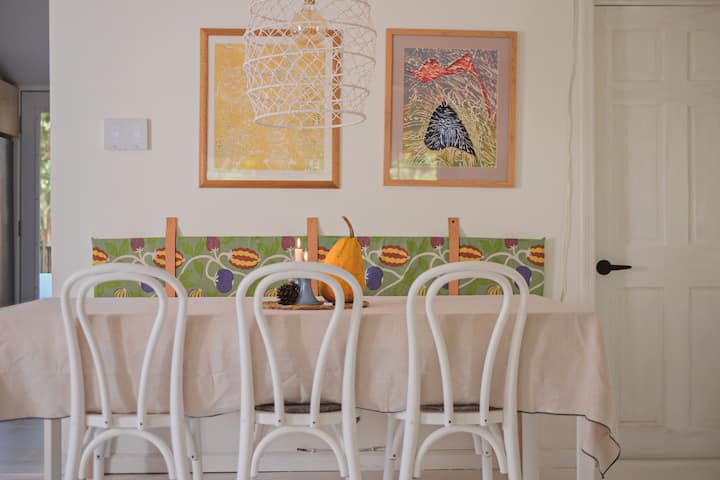 The newly remodeled kitchen features a gas stove and compact dishwasher. The kitchen is stocked with everything you need to make a meal including a Moccamaster coffee maker, French press, microwave, toaster, and Nutri Ninja blender. We offer our guests coffee, tea, olive oil, and basic spices. The dining table comfortably seats 6 people. Please note that the kitchen and dining room windows do not have curtains/shades.