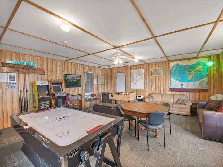 ***PLEASE NOTE: The game room is adjacent to the cabin entry door, just a couple steps away. It is heated with a pellet stove and space heaters in the winter and has AC in the summer. It may get chilly at night in the coldest winter temperatures unless you use the pellet stove.