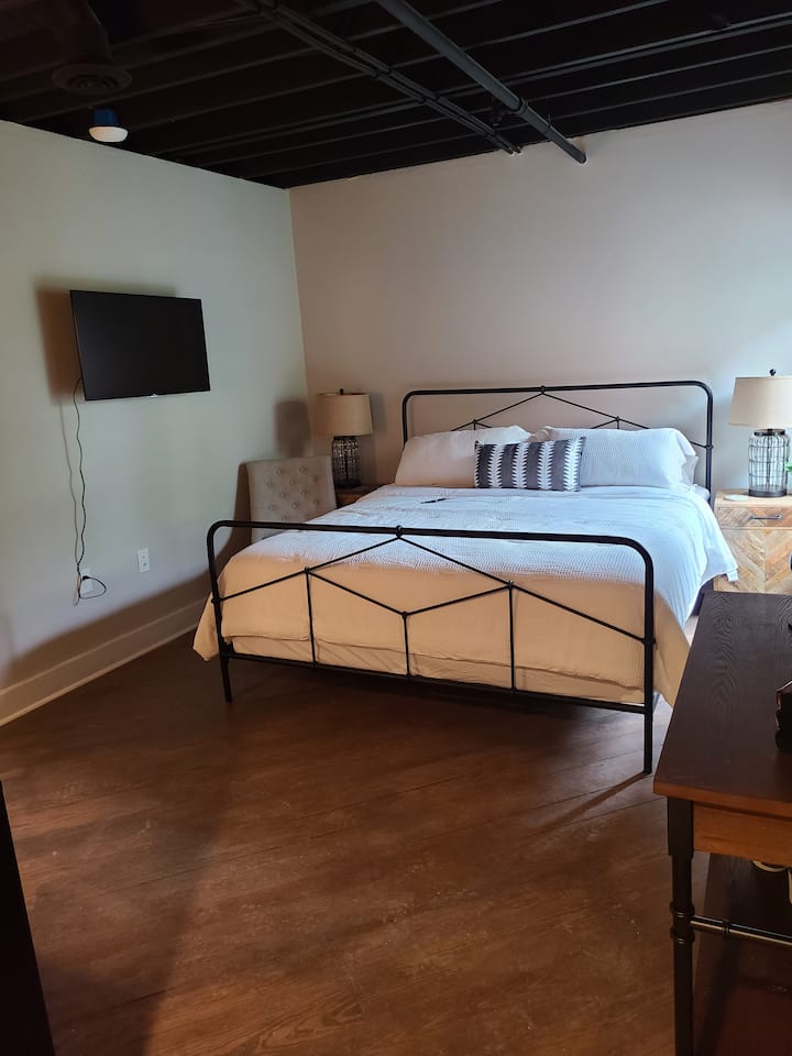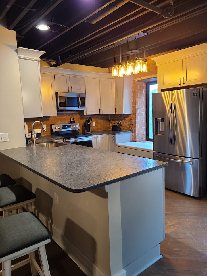 We have two newly built loft condos for lease in Kernersville, NC. They are located in the center of town, in easy walking distance to restaurants, shops, etc... This old furniture manufacturing building has been reworked for use as offices, retail stores, an event center, restaurants, and residential. Kernersville is in the middle of the Piedmont/Triad area. High Point, Greensboro and Winston-Salem are all a short drive from here. The courtyard in the center of the building is a lovely place to read a book or enjoy a glass of wine. We hope you enjoy your stay!
