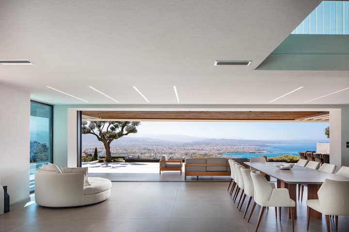 Set high above Chania in one of the town’s most sought-after locations, Villa Cavo Dago enjoys a commanding position with uninterrupted views across the city and its glittering bay.