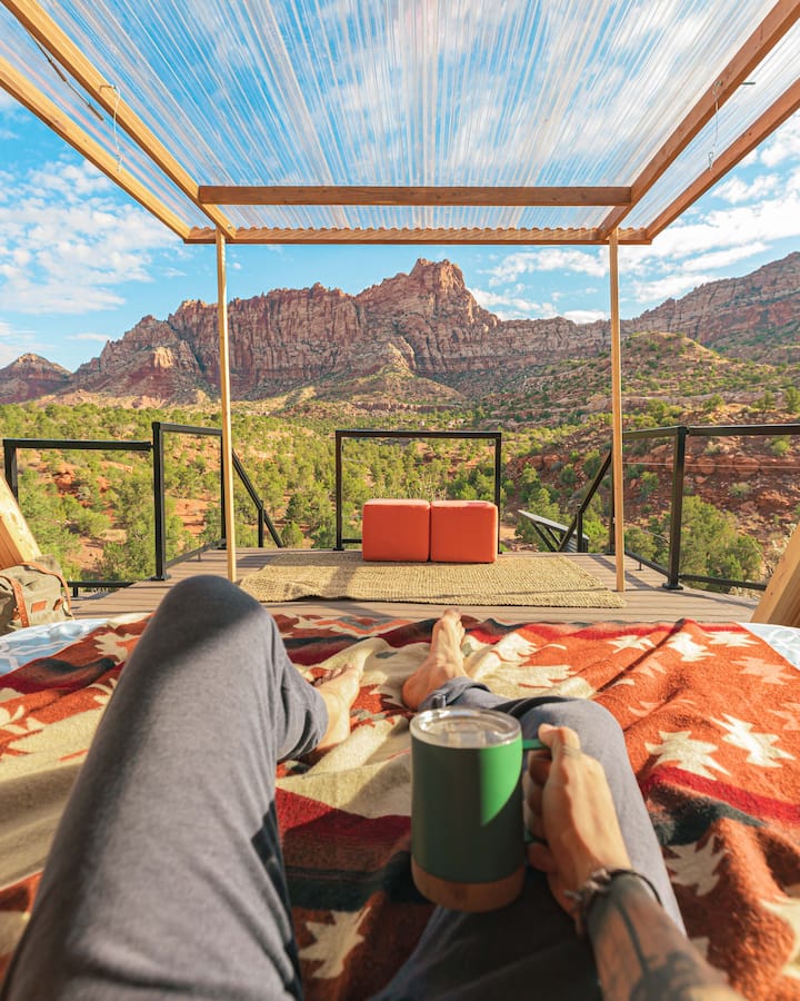 Located at the top of a 3-tier deck, this stunning property overlooks the Zion canyon. If that wasn't enough, a floor to ceiling window wall fully opens the cabin, allowing the views to spill inside, blurring the line between cabin & red rock.