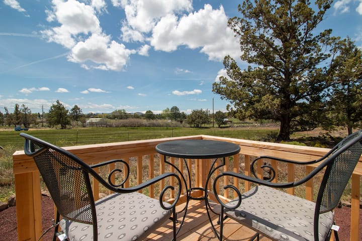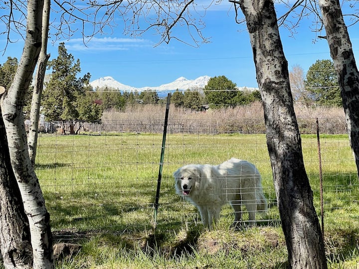 The deck and table for two is specifically placed for the views! Enjoy while sipping your morning coffee or eating dinner in as the sun sets behind the mountains. Overlooking pasture with a beautiful backdrop, you’ll spot Broken Top, The Three Sisters, and Mt Jefferson Cascade Mountains.