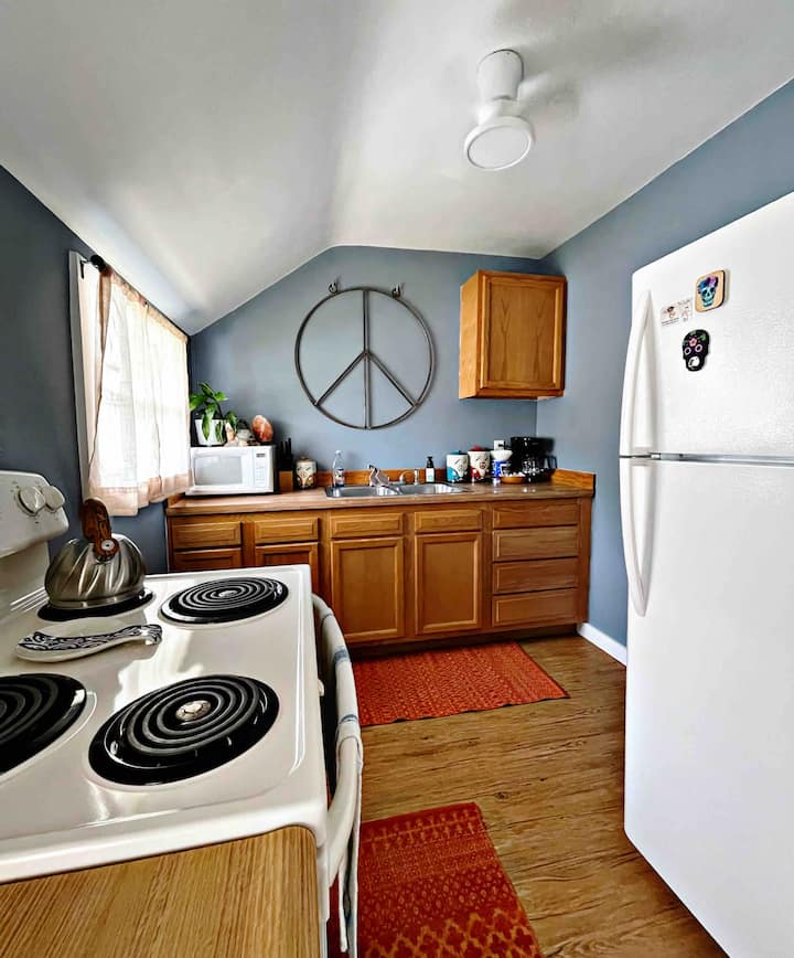 Our kitchen is stocked with the basics for cooking (pots, pans, etc.) plus a full size refrigerator/freezer and an electric stove/oven. Next to the coffee maker you will find complimentary coffee, cream & sugar. Microwave & small toaster included.