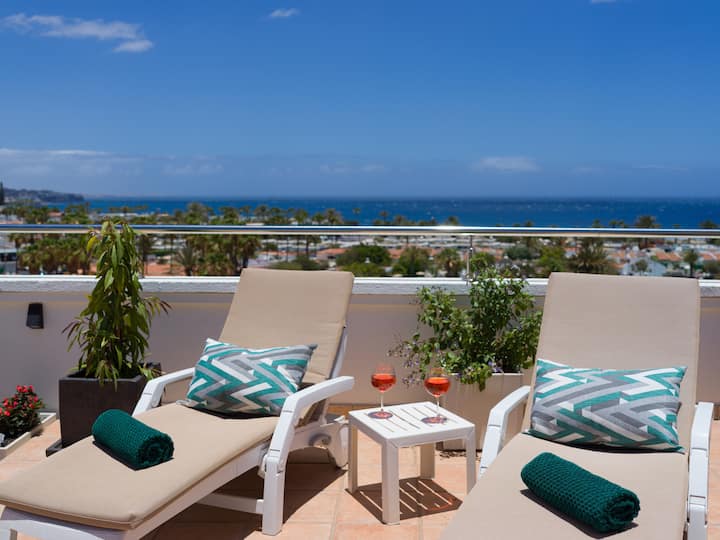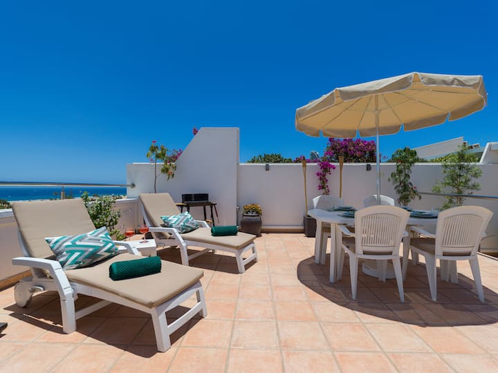 Escape to Casa LEX, a stunning 2-story penthouse in Gran Canaria with panoramic sea & dune views. Comfortably sleeps 4. Features a 55sqm private rooftop terrace with a gas grill, a shared heated pool & hot tub.